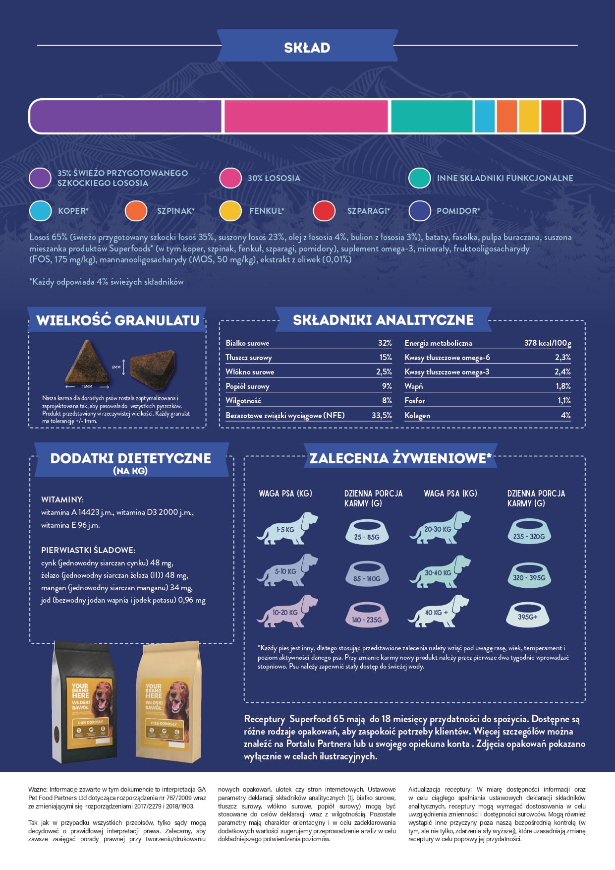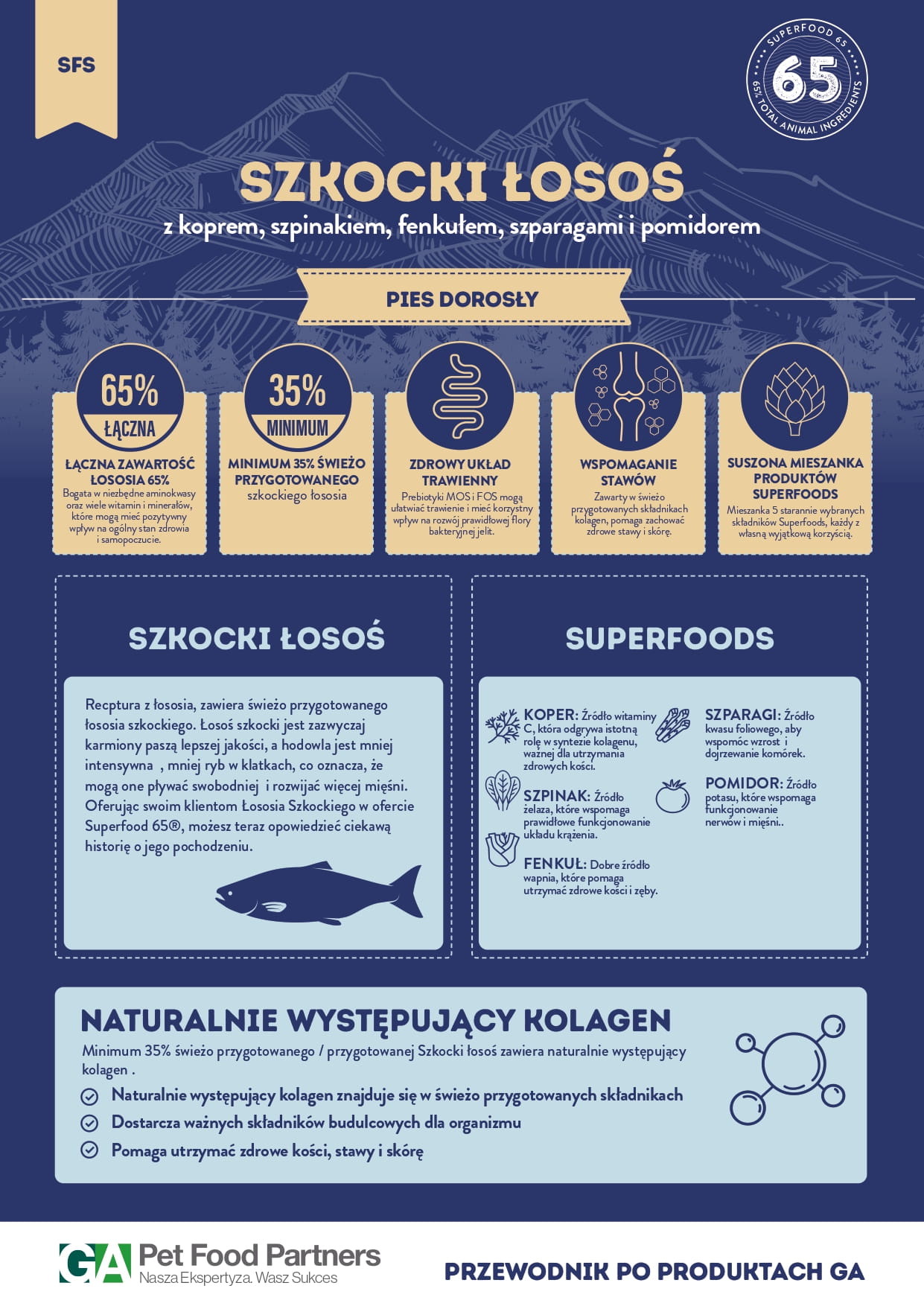 Pełnoporcjowa, bezzbożowa karma sucha dla dorosłych psów wszystkich ras, oparta na wysokiej jakości szkockim łososiu. Receptura Superfood 65 SFS została stworzona z myślą o psach wymagających – także tych z wrażliwym układem pokarmowym oraz skłonnościami do alergii.